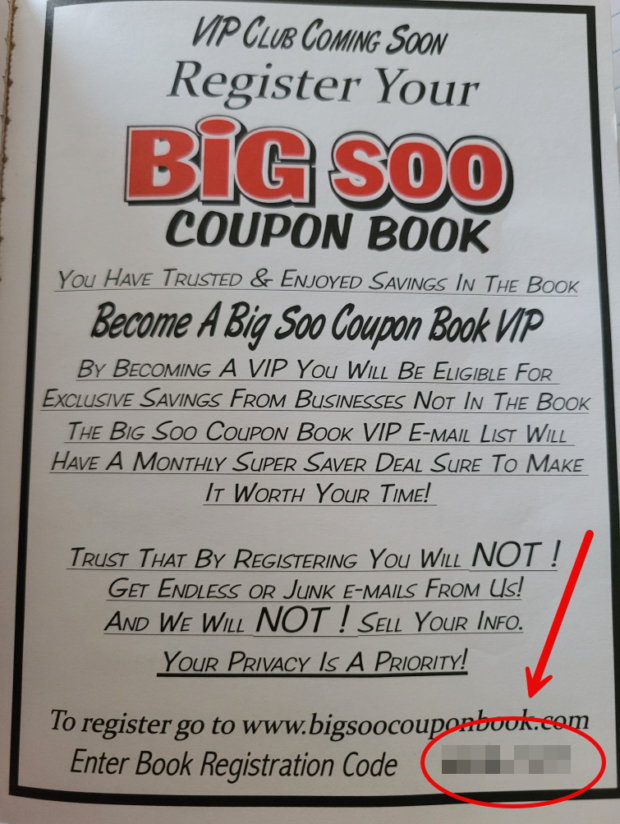 To register your book, please complete the form below. The Registration Code is located inside your paperback Big Soo Coupon Book as shown in the photo. First Name (required) Last Name (required) Your Email (required) Registration Code (required) Additional Comments (optional)